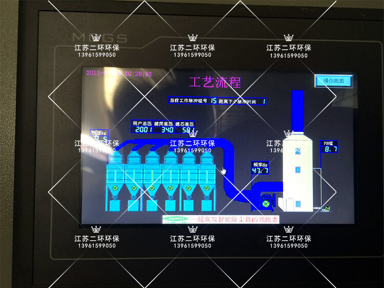 除尘器加装了相关检测的仪器仪表、通过PLC程序控制自动运行,通过触目屏展示。
